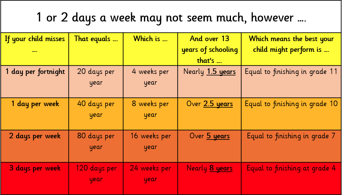 Good attendance at school is crucial for children’s social and educational development. Poor attendance can affect children's ability to make and keep friendships; a vital part of growing up. Setting good attendance patterns from an early age, from nursery through primary school will also help your child later on in their life. Pupils with no absence are 2.2 times more likely to achieve 5+ GCSEs A*- C or equivalent including English and mathematics - that shows how important good attendance is.